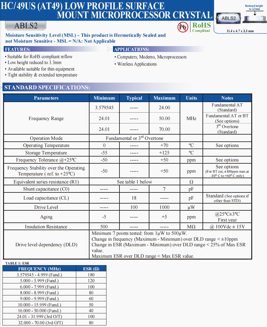 | ABLS2-18.432MHZ-B1U-T | Abracon | ABLS2 | 18.432 MHz | ±10ppm | ±10ppm | 18 pF |