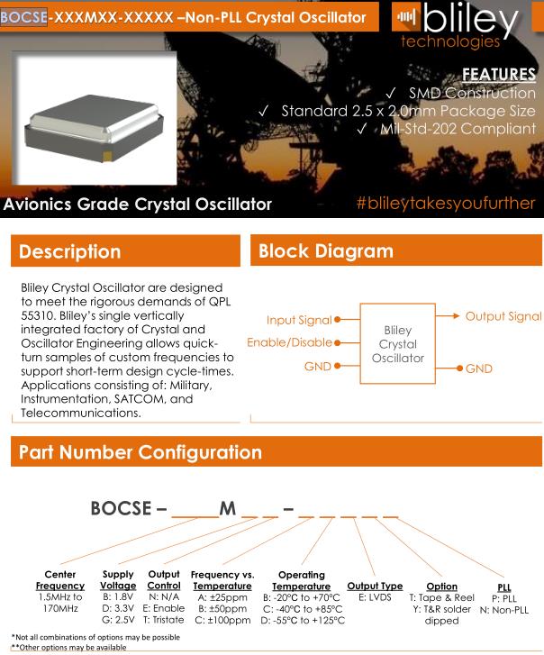 Bliley晶振,BOCSE晶振,BOCSE-26.000MEB-ACETP晶振,有源晶振,是指晶體本身起振需要外部電壓供應,起振后可直接驅動CMOS集成電路,產品本身已實現與薄型IC(TSSOP封裝,TVSOP封裝)同樣的1mm厚度,斷開時的消費電流是15µA以下,編帶包裝方式可對應自動搭載及IR回流焊接(無鉛對應)產品有幾種電壓供選1.8V,2.5V,3V3.3V,5V,以應對不同IC產品需要.Bliley晶振公司發展歷史: