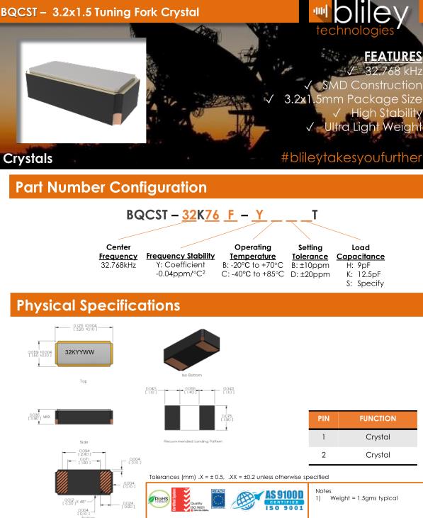 Bliley晶振,BQCST晶振,BQCST-32K76F-YCDHT晶振,32.768K時(shí)鐘晶體具有小型,薄型,輕型的貼片晶振表面音叉型晶體振蕩器,產(chǎn)品具有優(yōu)良的耐熱性,耐環(huán)境特性,可發(fā)揮晶振優(yōu)良的電氣特性,符合RoHS規(guī)定,滿足無鉛焊接的高溫回流溫度曲線要求,金屬外殼的封裝使得產(chǎn)品在封裝時(shí)能發(fā)揮比陶瓷振蕩器外殼更好的耐沖擊性.Bliley Technologies Inc. 最初于 1930 年作為 Bliley Piezo-Electric Company 成立。最初,我們?yōu)闃I(yè)余無線電市場制造石英晶體。在 1930 年代中期,我們的客戶和產(chǎn)品很快擴(kuò)大到與新興的軍事和商業(yè)通信領(lǐng)域的利益相匹配,我們的名稱更名為 Bliley Electric Company。1939 年,我們是最大的水晶公司,擁有 11 名員工。