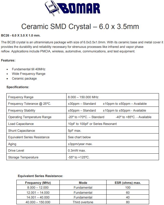 Bomar晶振,B1325-AAAS3T-10.000000晶振,SMD振蕩器,有源晶振,是指晶體本身起振需要外部電壓供應(yīng),起振后可直接驅(qū)動CMOS集成電路,產(chǎn)品本身已實(shí)現(xiàn)與薄型IC(TSSOP封裝,TVSOP封裝)同樣的1mm厚度,斷開時(shí)的消費(fèi)電流是15µA以下,編帶包裝方式可對應(yīng)自動搭載及IR回流焊接(無鉛對應(yīng))產(chǎn)品有幾種電壓供選1.8V,2.5V,3V3.3V,5V,以應(yīng)對不同IC產(chǎn)品需要..Bomar成立于 1963 年,是一家為商業(yè)和雙向無線電行業(yè)生產(chǎn)石英晶體的制造商。該業(yè)務(wù)的性質(zhì)要求在寬頻率范圍內(nèi)具有嚴(yán)格的容差和高穩(wěn)定性晶體,以滿足嚴(yán)格的 FCC 規(guī)范。快速生產(chǎn)的需求對我們不斷增長的客戶群很重要。我們的許多客戶都是當(dāng)?shù)亍⒅莺吐?lián)邦警察和監(jiān)視機(jī)構(gòu)。Bomar 很快不僅成為該市場的領(lǐng)先供應(yīng)商,而且因其產(chǎn)品質(zhì)量、快速周轉(zhuǎn)時(shí)間和無與倫比的客戶服務(wù)而獲得一致認(rèn)可。