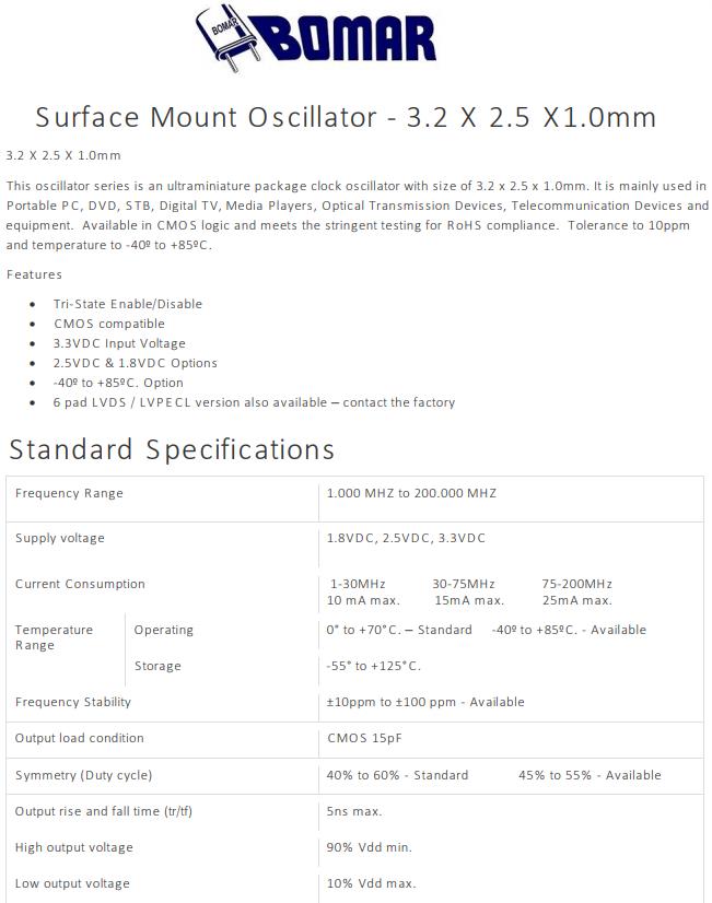 Bomar晶振,B1325-AABS3T-10.000000晶振,SMD晶體振蕩器,小型SMD有源晶振,從最初超大體積到現在的7050mm,6035mm,5032mm,3225mm,2520mm體積,有著翻天覆地的改變,體積的變小也使產品帶來了更高的穩定性能,接縫密封石英晶體振蕩器,精度高,覆蓋頻率范圍寬的特點,SMD高速自動安裝和高溫回流焊設計,Optionable待機輸出三態輸出功能,電源電壓范圍:1.8V~5V,高穩定性,低抖動,低功耗,主要應用領域:無線通訊,高端智能手機,平板筆記本WLAN,藍牙,數碼相機,DSL和其他IT產品的晶振應用,三態功能,PC和LCDM等高端數碼領域,符合RoHS/無鉛.Bomar 成立于 1963 年,是一家為商業和雙向無線電行業生產石英晶體的制造商。該業務的性質要求在寬頻率范圍內具有嚴格的容差和高穩定性晶體,以滿足嚴格的 FCC 規范??焖偕a的需求對我們不斷增長的客戶群很重要。我們的許多客戶都是當地、州和聯邦警察和監視機構。Bomar 很快不僅成為該市場的領先供應商,而且因其產品質量、快速周轉時間和無與倫比的客戶服務而獲得一致認可。