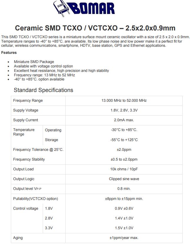 Bomar晶振,B1701-DEAS3R-20.000000晶振,TCXO溫補晶振,有源晶振,是指晶體本身起振需要外部電壓供應,起振后可直接驅動CMOS集成電路,產品本身已實現與薄型IC(TSSOP封裝,TVSOP封裝)同樣的1mm厚度,斷開時的消費電流是15µA以下,編帶包裝方式可對應自動搭載及IR回流焊接(無鉛對應)產品有幾種電壓供選1.8V,2.5V,3V3.3V,5V,以應對不同IC產品需要.Bomar 成立于 1963 年,是一家為商業和雙向無線電行業生產石英晶體的制造商。該業務的性質要求在寬頻率范圍內具有嚴格的容差和高穩定性晶體,以滿足嚴格的 FCC 規范。快速生產的需求對我們不斷增長的客戶群很重要。我們的許多客戶都是當地、州和聯邦警察和監視機構。Bomar 很快不僅成為該市場的領先供應商,而且因其產品質量、快速周轉時間和無與倫比的客戶服務而獲得一致認可。