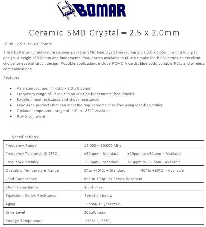 Bomar晶振,BC38晶振,BC38EFA120-10.000000晶振,小型貼片石英晶振,外觀尺寸具有薄型表面貼片型石英晶體振蕩器,特別適用于有小型化要求的市場領(lǐng)域,比如智能手機(jī),無線藍(lán)牙,平板電腦等電子數(shù)碼產(chǎn)品.晶振本身超小型,薄型,重量輕,晶體具有優(yōu)良的耐環(huán)境特性,如耐熱性,耐沖擊性,在辦公自動化,家電相關(guān)電器領(lǐng)域及Bluetooth,WirelessLAN等短距離無線通信領(lǐng)域可發(fā)揮優(yōu)良的電氣特性,滿足無鉛焊接的回流溫度曲線要求.Bomar 成立于 1963 年,是一家為商業(yè)和雙向無線電行業(yè)生產(chǎn)石英晶體的制造商。該業(yè)務(wù)的性質(zhì)要求在寬頻率范圍內(nèi)具有嚴(yán)格的容差和高穩(wěn)定性晶體,以滿足嚴(yán)格的 FCC 規(guī)范。快速生產(chǎn)的需求對我們不斷增長的客戶群很重要。我們的許多客戶都是當(dāng)?shù)亍⒅莺吐?lián)邦警察和監(jiān)視機(jī)構(gòu)。Bomar 很快不僅成為該市場的領(lǐng)先供應(yīng)商,而且因其產(chǎn)品質(zhì)量、快速周轉(zhuǎn)時(shí)間和無與倫比的客戶服務(wù)而獲得一致認(rèn)可。