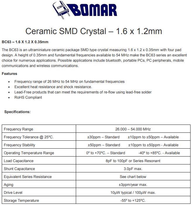 Bomar晶振,BC63晶振,BC63EFD120-30.000000晶振,貼片晶振本身體積小,超薄型石英晶體振蕩器,特別適用于有目前高速發展的高端電子數碼產品,因為晶振本身小型化需求的市場領域,小型,薄型是對應陶瓷振蕩器(偏差大)和普通的石英晶體振蕩器(偏差小)的中間領域的一種性價比較出色的產品.產品廣泛用于筆記本電腦,無線電話,衛星導航SSD,USB,Blu-ray等用途,符合無鉛焊接的高溫回流焊曲線特性.Bomar成立于 1963 年,是一家為商業和雙向無線電行業生產石英晶體的制造商。該業務的性質要求在寬頻率范圍內具有嚴格的容差和高穩定性晶體,以滿足嚴格的 FCC 規范。快速生產的需求對我們不斷增長的客戶群很重要。我們的許多客戶都是當地、州和聯邦警察和監視機構。Bomar 很快不僅成為該市場的領先供應商,而且因其產品質量、快速周轉時間和無與倫比的客戶服務而獲得一致認可。