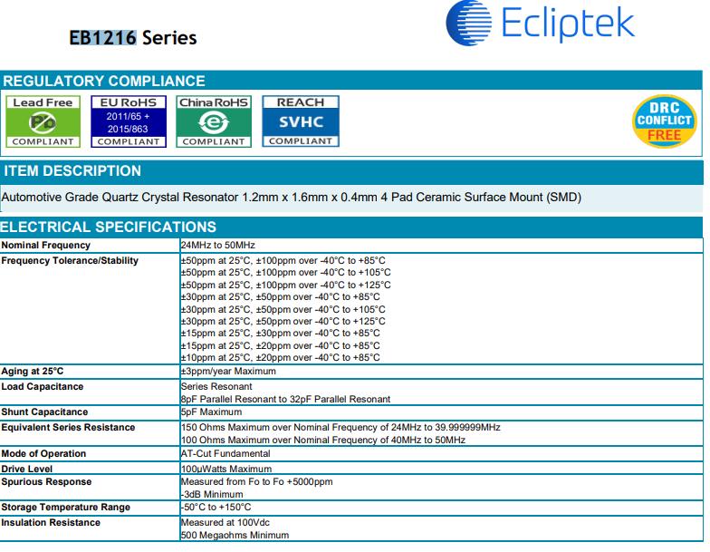 | EB1216YA10-25.000M TR | Ecliptek | EB1216 | MHz 晶體 | 25 MHz | ±50ppm | ±30ppm | 10pF |
