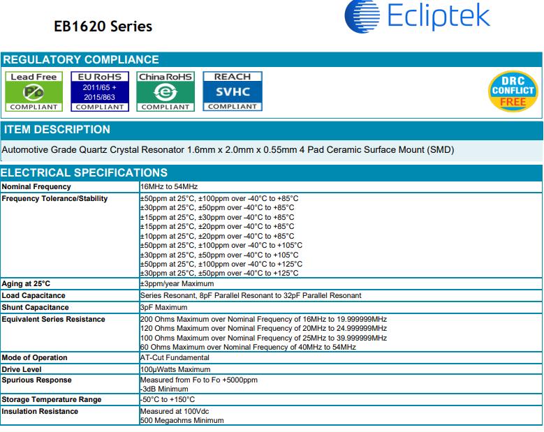 EB1620JA10-20.000M-TR晶振 參數表| 日蝕晶振規格 | 單位 | EB1620晶振頻率范圍 | 石英晶振基本條件 |