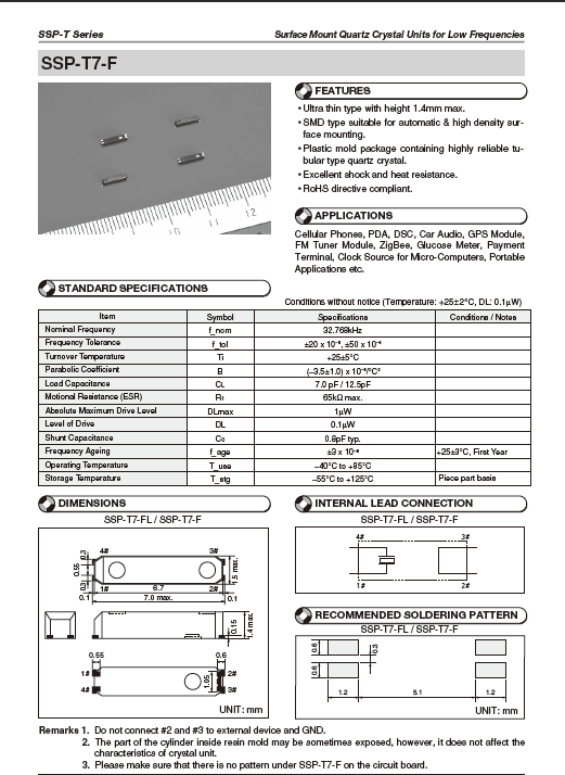 SSP-T7-F貼片晶振,也稱精工表晶,是日本精工晶振公司現(xiàn)在推出的銷量最多的一款32.768KHZ晶振,SSP-T7-F有高溫度物力化學性能以外,還有彈性震動耗損小,現(xiàn)在在品質(zhì)要求可以百萬分之一的特點,因此它是一種頻率穩(wěn)定的電子元件,應用廣泛于無線電,通訊,鐘表等產(chǎn)品上面的.