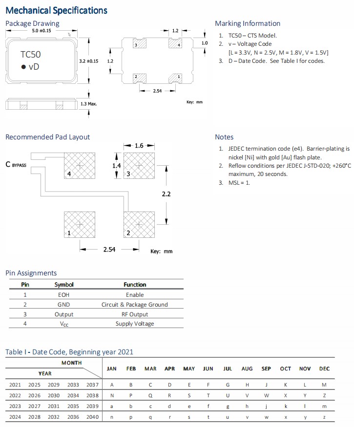 TC50晶振特點:尺寸5.0x3.2x1.3mm貼片晶振,低功耗,最大值為200µA,陶瓷表面安裝封裝,基本水晶設(shè)計,+1.8V,+2.5V或+3.3V工作電壓,工作溫度范圍:-40°C到+85°C,