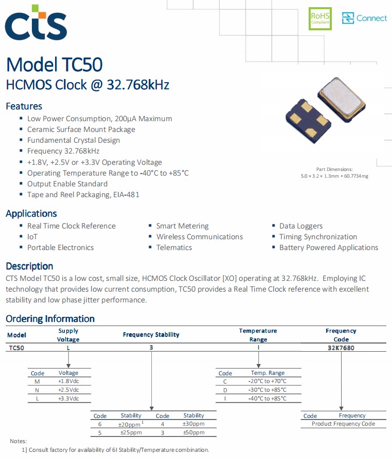 32.768K振蕩器TC50V5C32K7680具有低相位抖動性能的實時時鐘參考,CTS晶振型號TC50,是一款小尺寸5.0x3.2x1.3mm封裝,四腳貼片晶振,有源晶振,石英晶體振蕩器,HCMOS時鐘振蕩器[XO],頻率32.768kHz,TC50采用了提供低電流消耗的IC技術(shù),提供了一個具有優(yōu)異的穩(wěn)定性和低相位抖動性能的實時時鐘參考。