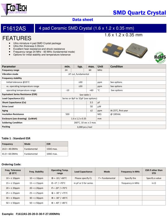 FCD-Tech Crystal專業給市場提供的廣泛的荷蘭 FCD-Tech晶體,有源晶振,石英晶體,石英晶體振蕩器,VCXO壓控晶振等元件,提供的工業級機械等產品中,具有高精度,低抖動,低相位噪聲等特點,符合當下市場對頻率元器件的需求.FCD-Tech晶振,F1612AS晶振,F1612AS‐2020D30F‐24.000MHz晶振.