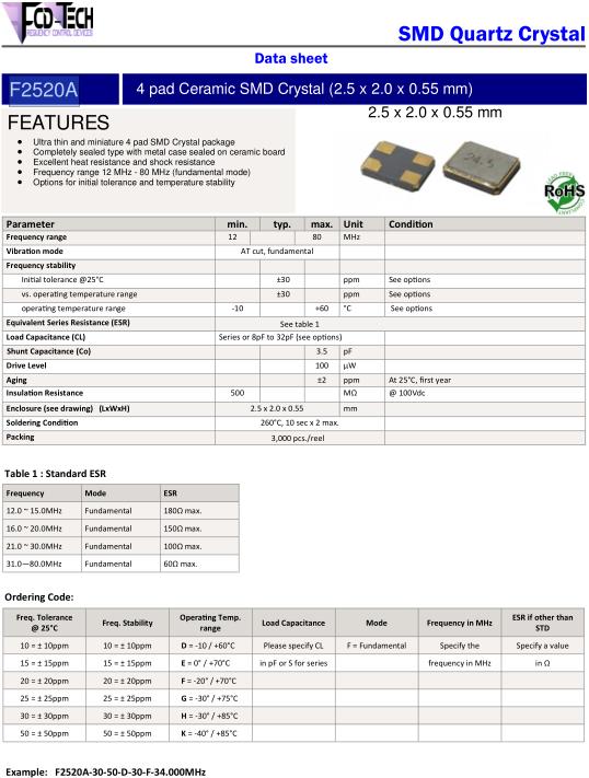 FCD-Tech晶振,F2520A晶振,F2520A‐3050D30F‐10.000MHz晶振