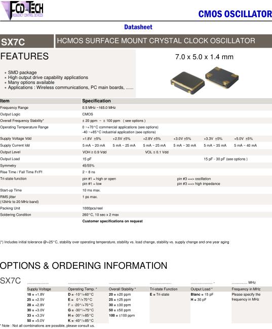 FCD-Tech晶振,SX7C晶振,SX7C-18K20EH-24.000MHz晶振,小型SMD有源晶振,從最初超大體積到現在的7050mm,6035mm,5032mm,3225mm,2520mm體積,有著翻天覆地的改變,體積的變小也使產品帶來了更高的穩定性能,接縫密封石英晶體振蕩器,精度高,覆蓋頻率范圍寬的特點,SMD高速自動安裝和高溫回流焊設計,Optionable待機輸出三態輸出功能,電源電壓范圍:1.8V~5V,高穩定性,低抖動,低功耗,主要應用領域:無線通訊,高端智能手機,平板筆記本WLAN,藍牙,數碼相機,DSL和其他IT產品的晶振應用,三態功能,PC和LCDM等高端數碼領域,符合RoHS/無鉛.