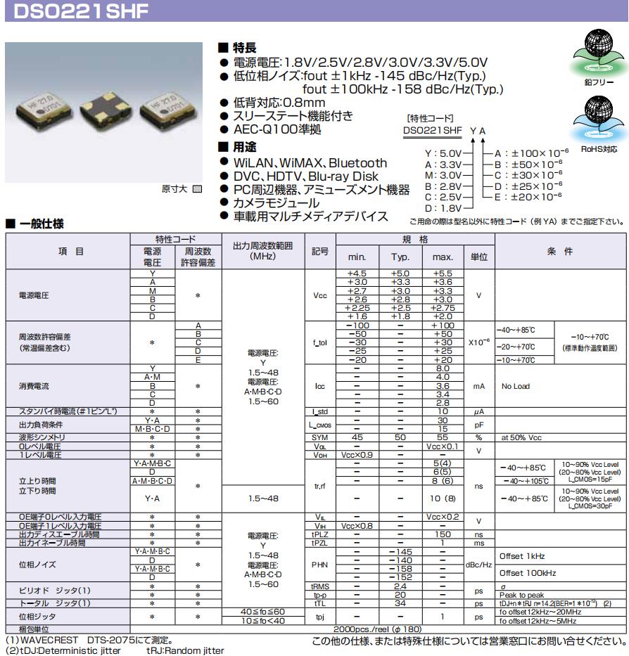 1XSF024000AR29 DSO221SHF 2520mm 相機模塊 1.8V 24MHZ 參數表| 項 目 | 特性コード |