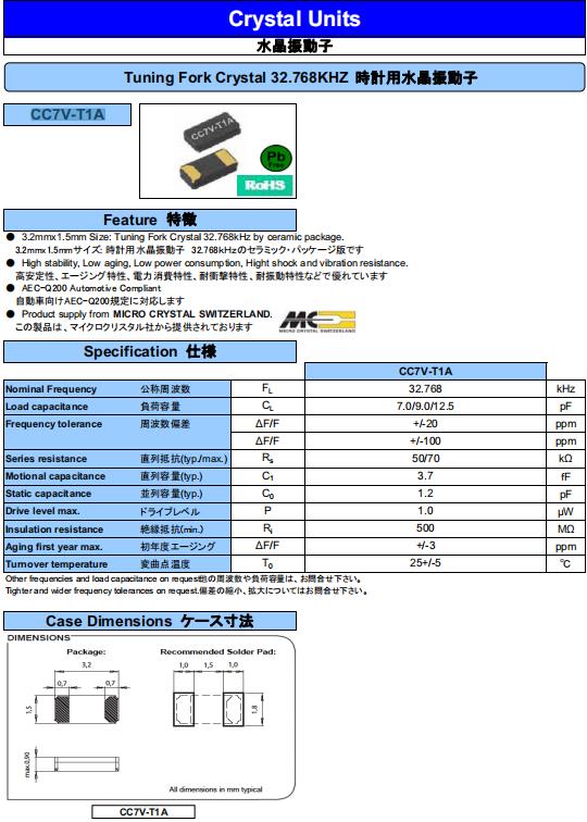| CC7V-T1A-32.768kHz-7pF-20PPM-TB-QC | Micro Crystal | 晶體 32.768 kHz 7.0 pF +/-20 PPM -40/+125C | Crystals | 32.768 kHz | 20 PPM | - 40 C | + 125 C | |