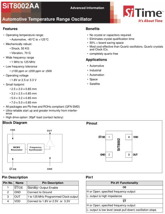 SiTime晶振,SiT8002AA晶振,SiT8002AA-14-33E-123.12345T晶振,有源晶振,是指晶體本身起振需要外部電壓供應,起振后可直接驅動CMOS集成電路,產品本身已實現與薄型IC(TSSOP封裝,TVSOP封裝)同樣的1mm厚度,斷開時的消費電流是15µA以下,編帶包裝方式可對應自動搭載及IR回流焊接(無鉛對應)產品有幾種電壓供選1.8V,2.5V,3V3.3V,5V,以應對不同IC產品需要.