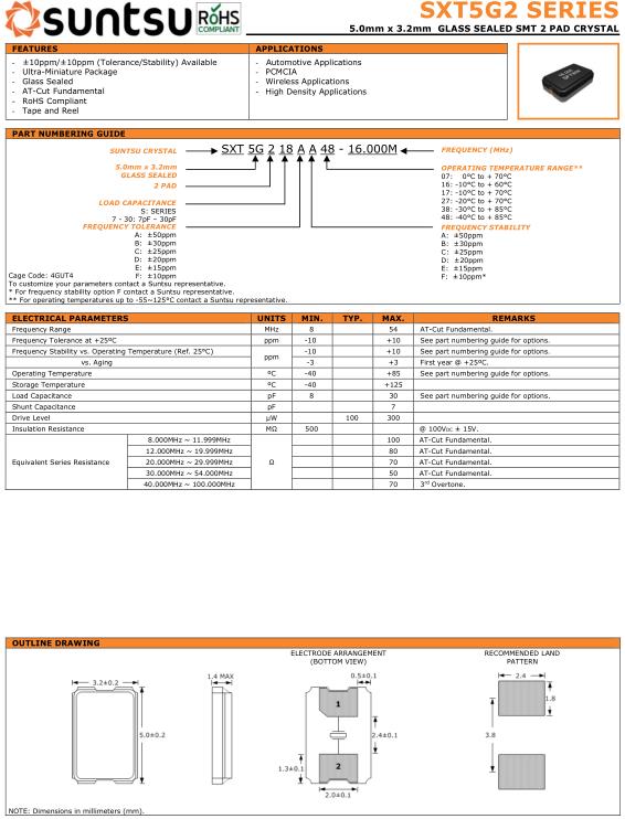 | Suntsu晶振規格 | 單位 | SXT5G2晶振頻率范圍 | 石英晶振基本條件 | |