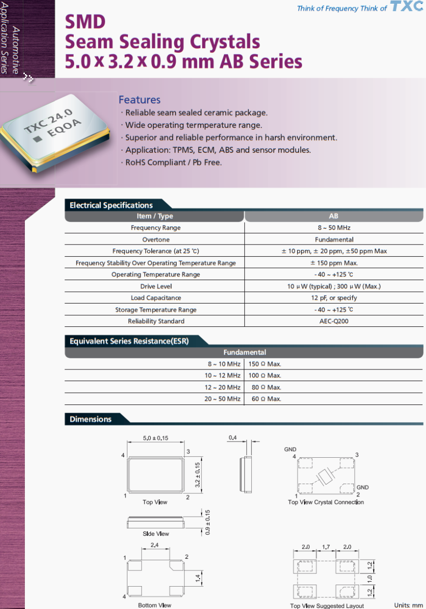 TXC臺(tái)產(chǎn)晶體,AB-12.000MALE-T四腳晶振,汽車胎壓檢測(cè)裝置晶振,AB系列SMD,縫封晶體,5.0* 3.2* 0.9 mm ,特點(diǎn),可靠的縫封陶瓷封裝。工作溫度范圍寬。惡劣環(huán)境下性能優(yōu)越可靠。應(yīng)用范圍:TPMS, ECM, ABS,傳感器模塊。符合rohs標(biāo)準(zhǔn)/不含鉛臺(tái)灣TXC晶振公司,晶技晶振,無(wú)源晶振,5032晶振,AB-12.000MALE-T晶振,汽車晶振,汽車電動(dòng)天窗控制系統(tǒng)晶振,臺(tái)灣晶振,貼片晶振,四腳晶振,石英晶振,高品質(zhì)晶振,車載多媒體晶振,行車記錄儀晶振,低損耗晶振,耐高溫晶振,耐沖擊晶振。
