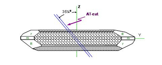 在各種不同種類的切割角度方式中, AT角度切割的石英芯片適用在數MHz到數佰MHz的頻率范圍,是石英芯片應用范圍最廣范及使用數量最多的一種切割應用方式. 在(圖2)中, 從石英晶棒X-軸向的上視圖, 可以看到對Z-軸向旋轉約35度的AT 方向. 這在大量生產的技術上也是很好達成的一種作業方式.