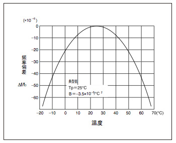 "VT200F-6PF20PPM", 音叉型石英晶振的頻率溫度特性如左側(cè)的曲線圖所示,顯示了以+25°C為頂點的負向2次方程曲線. 溫度范圍越寬,則頻率的變化量也越大,因此,需要 考慮一下所使用環(huán)境的溫度范圍和必要的精度.
