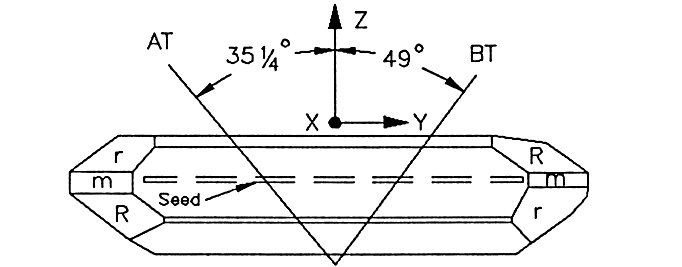 以上是用于制造at切割諧振器的由y取向種子晶體生長的培養(yǎng)石英晶體的示意圖。種子晶體建立了最初的晶體取向,并以犧牲z軸為代價促進(jìn)了Y方向的生長。晶種是經(jīng)過精心挑選的,以避免在晶體生長過程中可能產(chǎn)生的缺陷。表明了晶種的位置。從x軸向左傾斜的線表示AT板的鋸切位置,向右傾斜的線表示bt切割。在實(shí)踐中,這些角度是非常關(guān)鍵的,并使用布拉格x射線衍射精確確定。